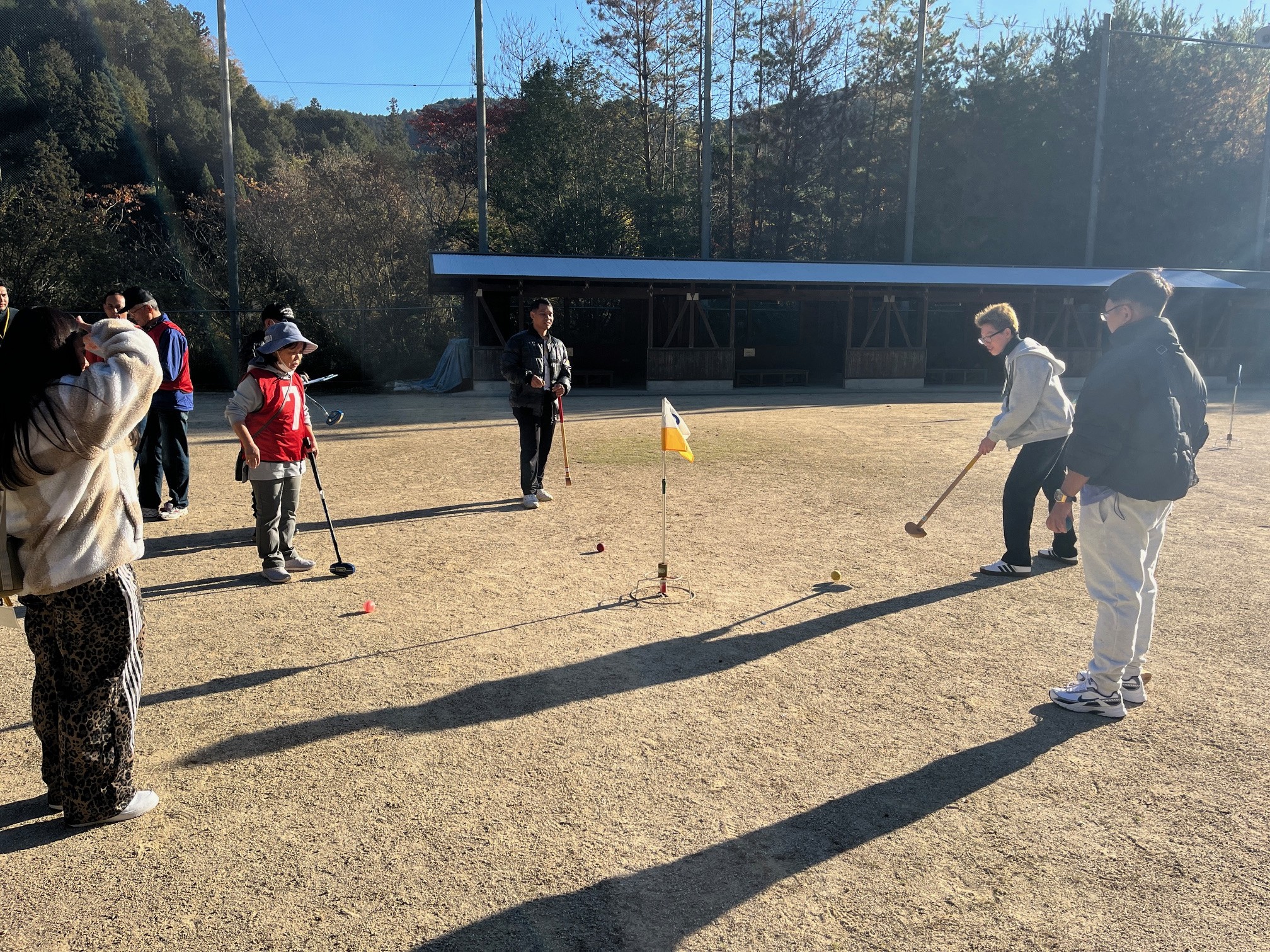 まずは、三野町で活動している「子育てグループくろーばー」の子ども食堂にて、会場案内やお弁当の準備など運営のお手伝いをしました。母国のお菓子やジュースを振る舞い、射的やダーツなどのゲームで地域の子供たちと交流しました。次に、山城町で活動している「川口・大川持グラウンドゴルフクラブ」の皆さんと一緒に、グラウンドゴルフをプレーしながら楽しみました。留学生が人生初の1球目でホールインワンを出して驚きの場面もあり、にぎやかな時間でした。